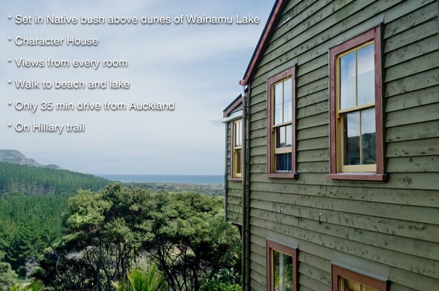Ara Station is a unique rustic guest house nestled in native bush on the edge of the Lake Wainamu sand dunes and overlooking Bethells Beach/Te Henga. It is conveniently placed on the famous Hillary Trail and is situated on an Ara (a traditonal Maori pathway). The house is is built in the style of an old New Zealand railway station, using ecological timber. The spacious rooms all have spectacular views and each have their own character. Here you'll fall asleep to the sound of the waves, the plaintive call of the ruru/morepork (a small native owl) and wake to the chorus of many native birds.
